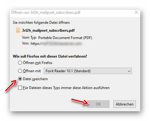 Die Option “Datei speichern” anklicken; dann auf OK:
