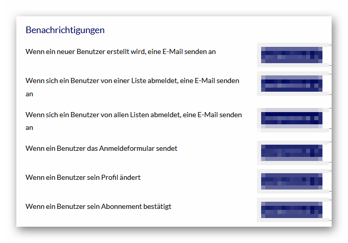 Mit der Eingabe entsprechender E-Mail-Adressen wird der Administrator der Website über An- und Abmeldungen zum Newsletter informiert: