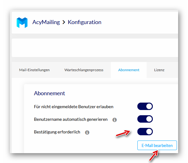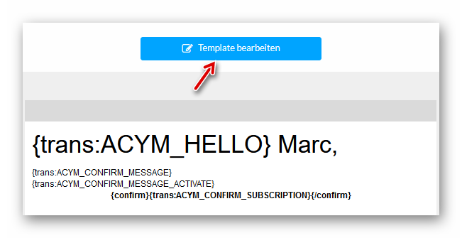 Zum Einrichten der Bestätigungsmail klicken wir auf AcyMailing -> Konfiguration -> Abonnement. Der Schalter “Bestätigung erforderlich” muss aktiv sein. Dann auf den Button “E-Mail bearbeiten” klicken: