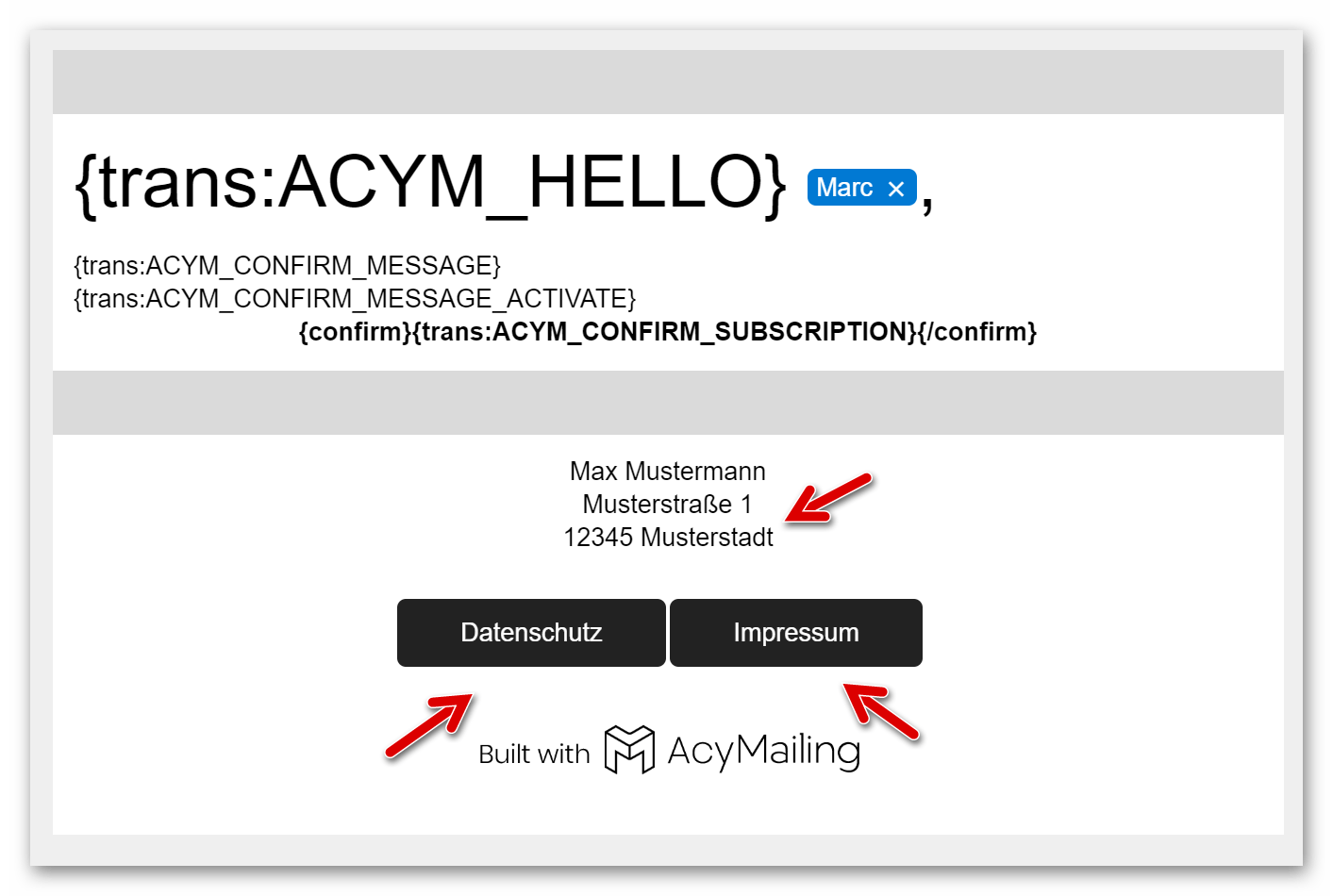 Nach der DSGVO und um Missbrauch zu vermeiden muss jede Anmeldung zu einem Newsletter vom Anmelder durch Klick auf einen Link bestätigt werden (Double Opt-in-Verfahren). In der Bestätigungsmail muss die Anschrift des Newsletter-Versenders sowie jeweils ein Link zu Impressum und Datenschutzerklärung vorhanden sein.