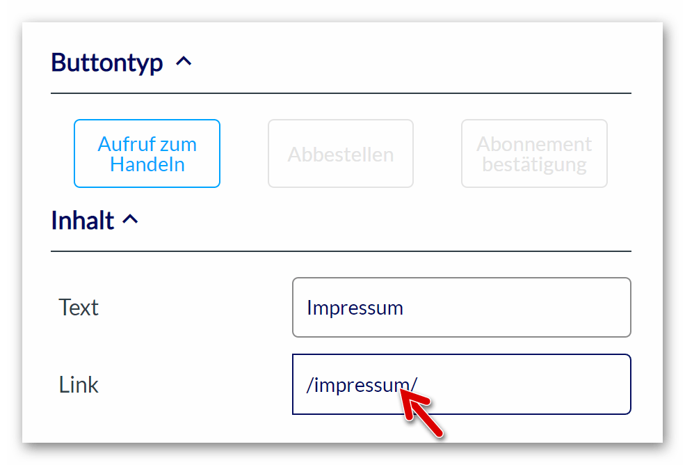 Links zu Datenschutz bzw. Impressum können örtlich abweichend sein. Dann ist der Link in den Eingabefeldern der beiden oben gezeigten Eingabemasken anzupassen.