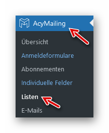 Wir klicken im Dashboard auf AcyMailing -> Listen…