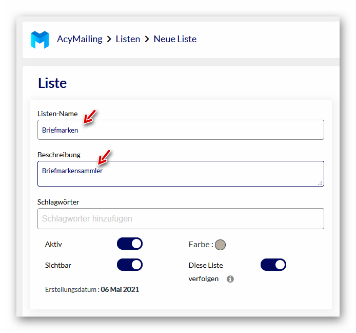 Für die erste Liste “Briefmarken” geben wir die erforderlichen Angaben ein: