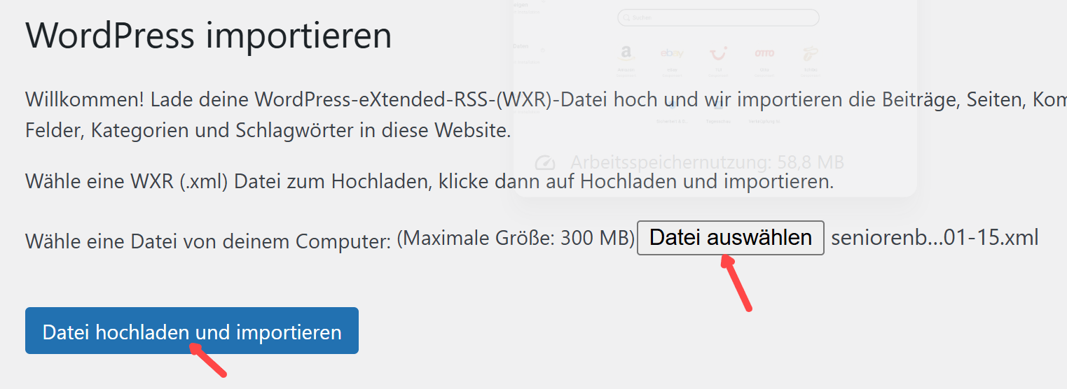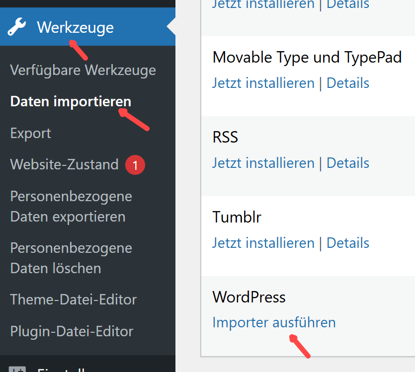 Wir klicken auf Werkzeuge -> Daten importieren und starten den WordPress Importer: