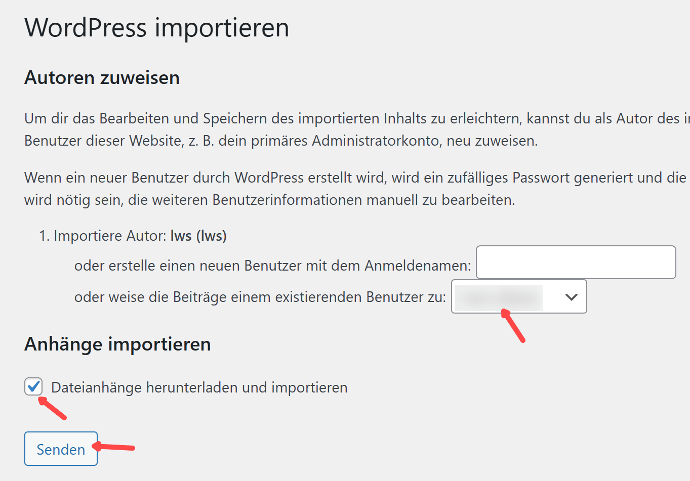Wir weisen den gewünschten Benutzer (Autor) zu und setzen das gezeigte Häkchen, um auch die Dateianhänge zu importieren: