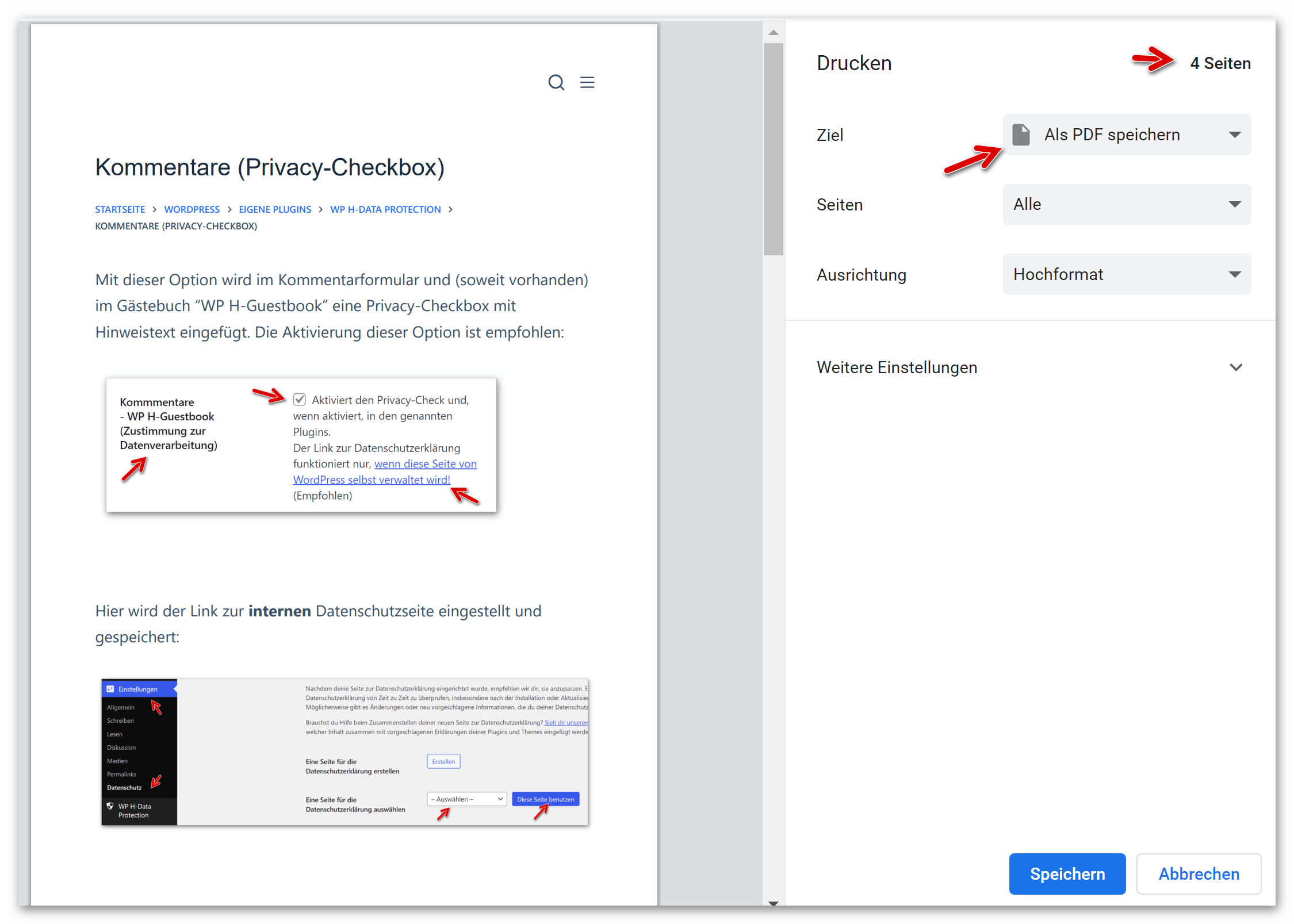 Mit diesen Voreinstellungen erstellen wir zunächst eine PDF-Datei, welche 4 Seiten enthält. Dabei wird bei diesem Beispiel nur der reine Inhalt und nicht Kopf-/Fußzeilen und die seitliche Navigation erfasst: