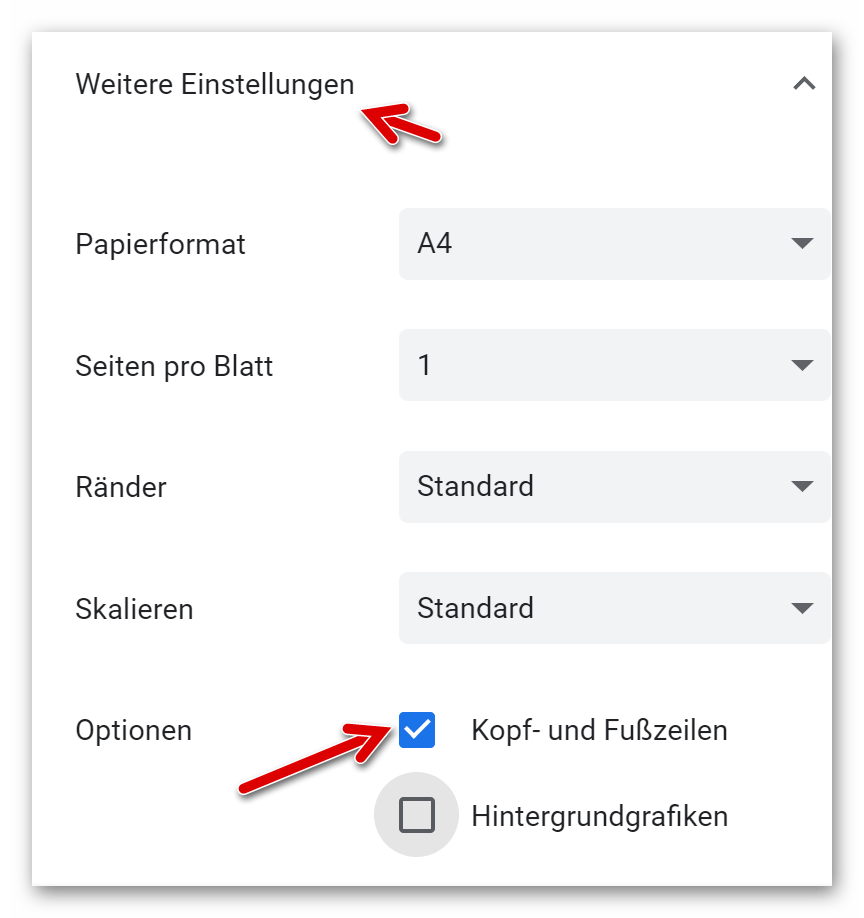Bei den weiteren Einstellungen lassen sich beispielsweise Kopf- und Fußzeilen mit speichern bzw. drucken: